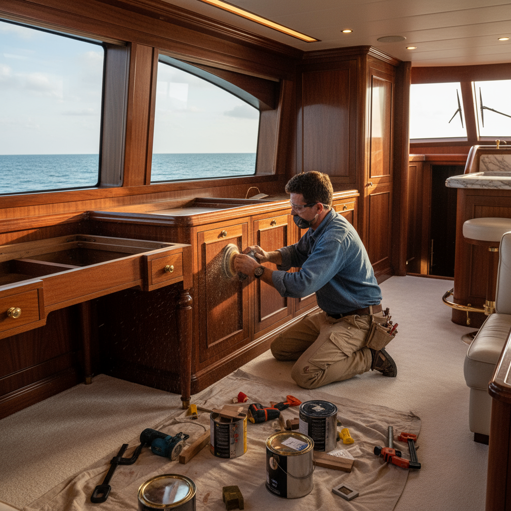 A craftsman applying varnish to teak wood panels inside a yacht.